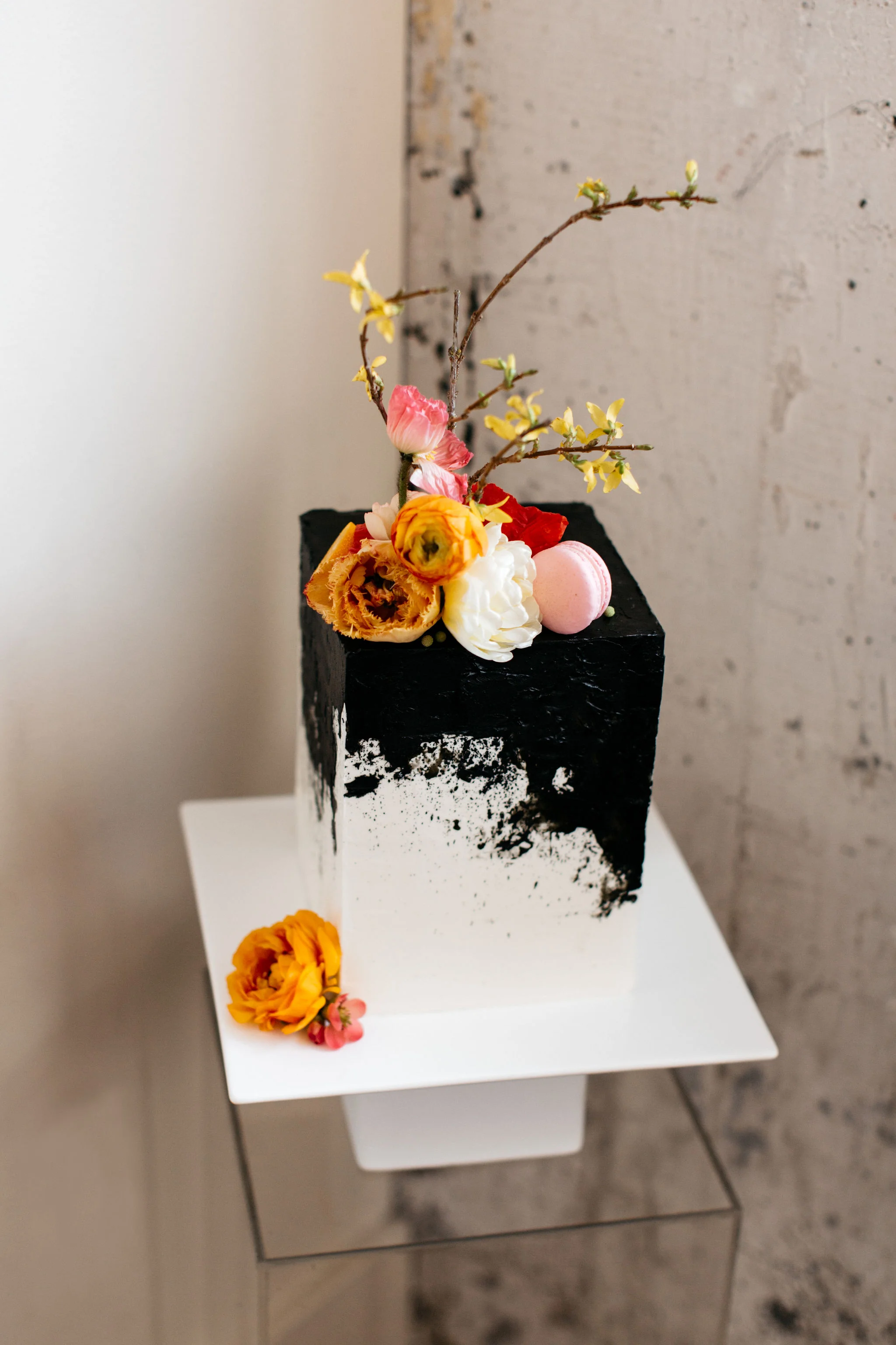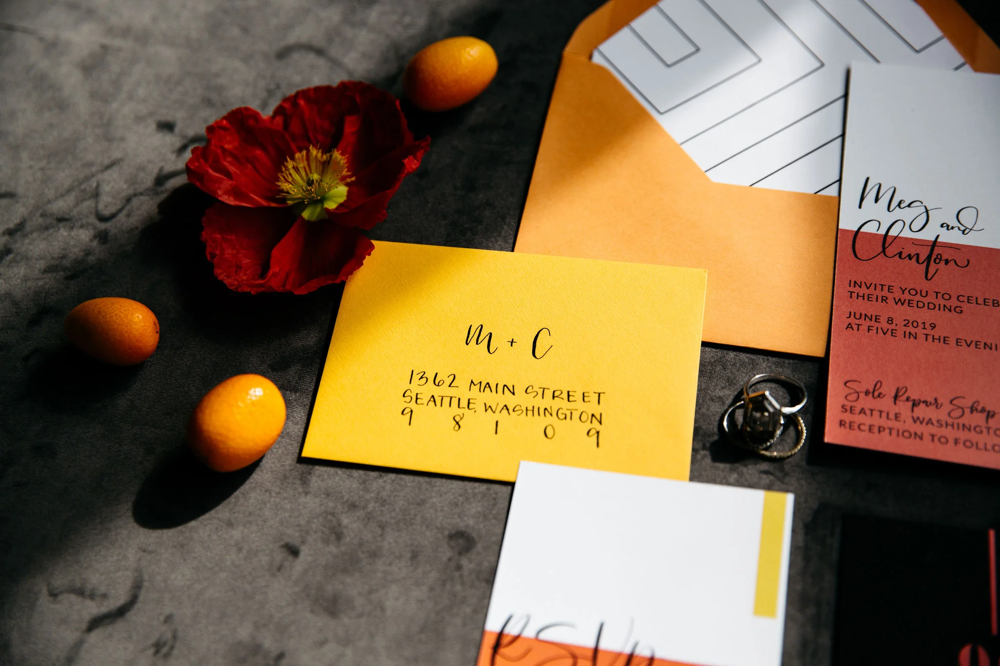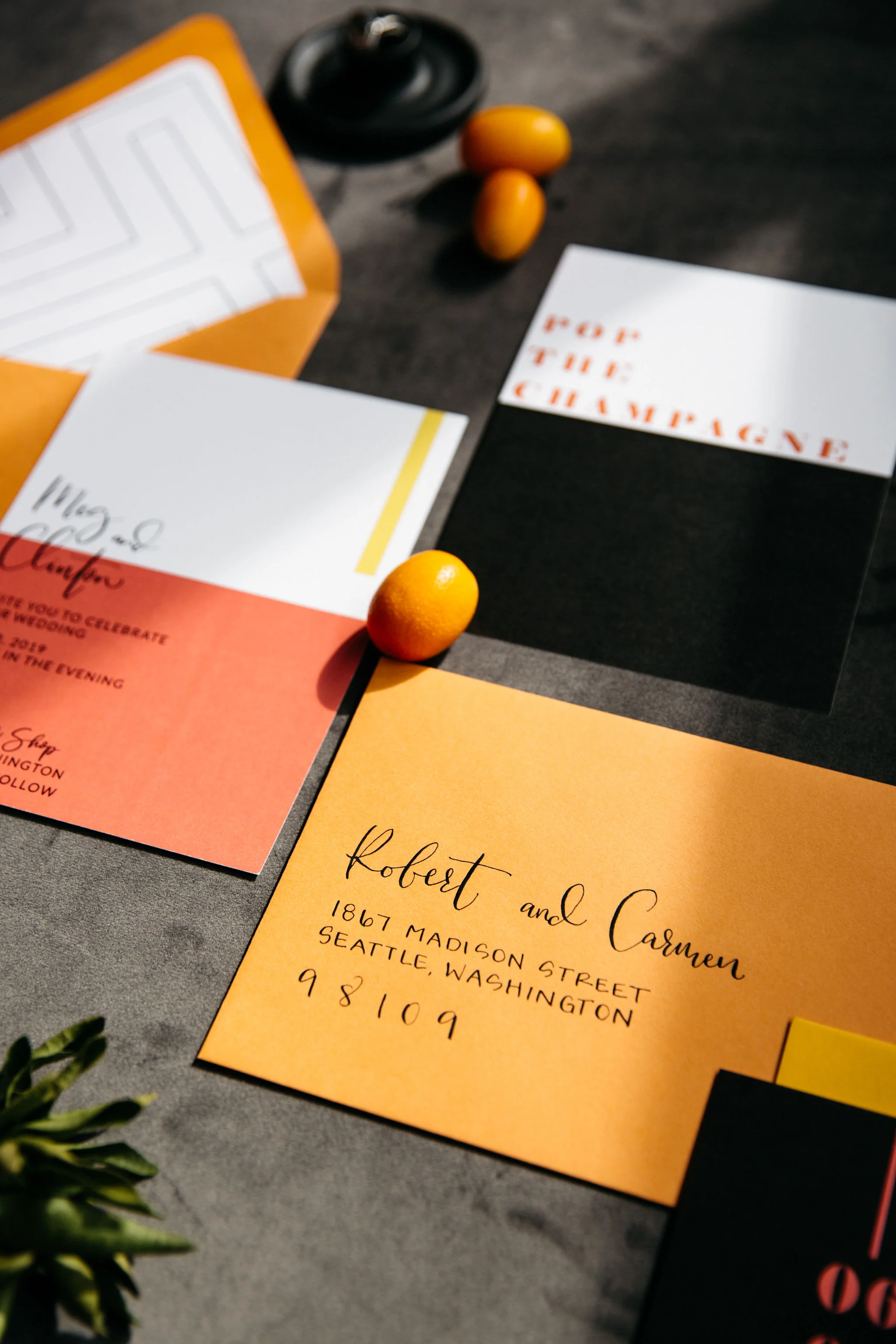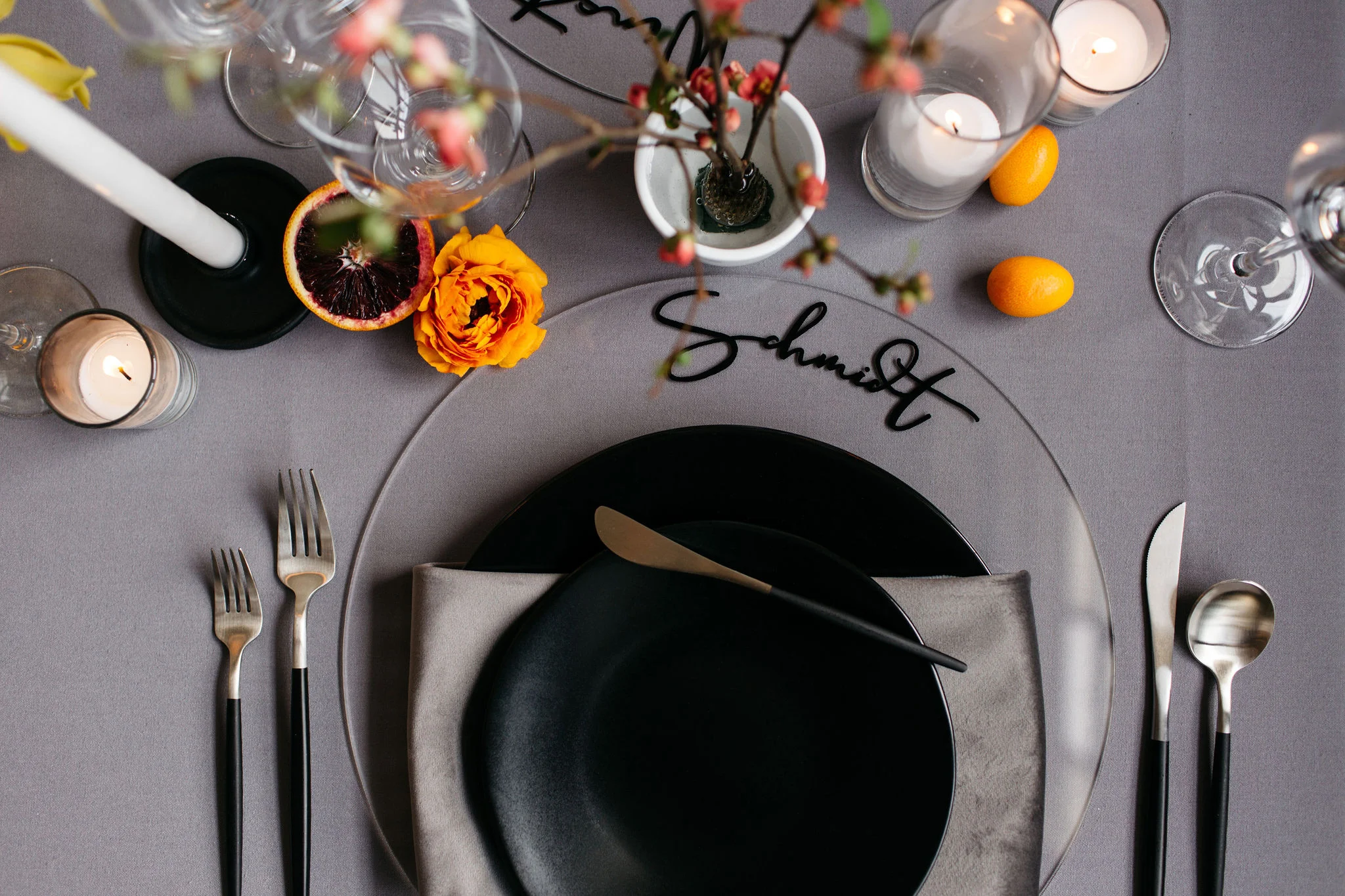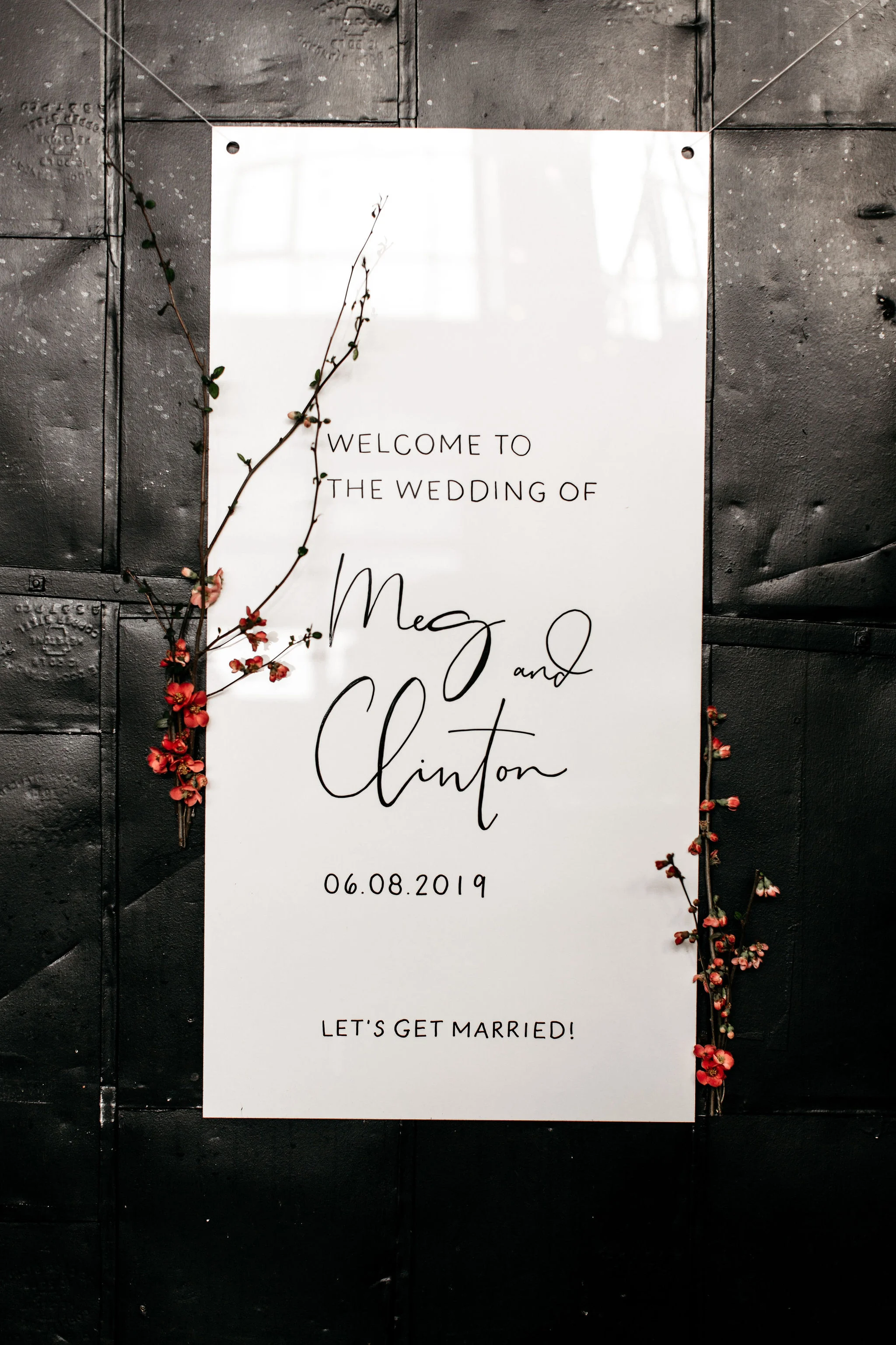 For this shoot, I created a two sided, coral and citrus inspired, modern invitation suite complete with a geometric envelope liner! Fun fact - my inspiration for this envelope liner came from the new fireplace tile we installed during our basement remodel. Guest names were handwritten on top of clear acrylic charger plates that doubled as place cards! They were the perfect touch to accompany the black + velvet place setting from CORT Party Rental’s! The for the welcome sign, I used white acrylic with black ink to create a modern and minimal design!
